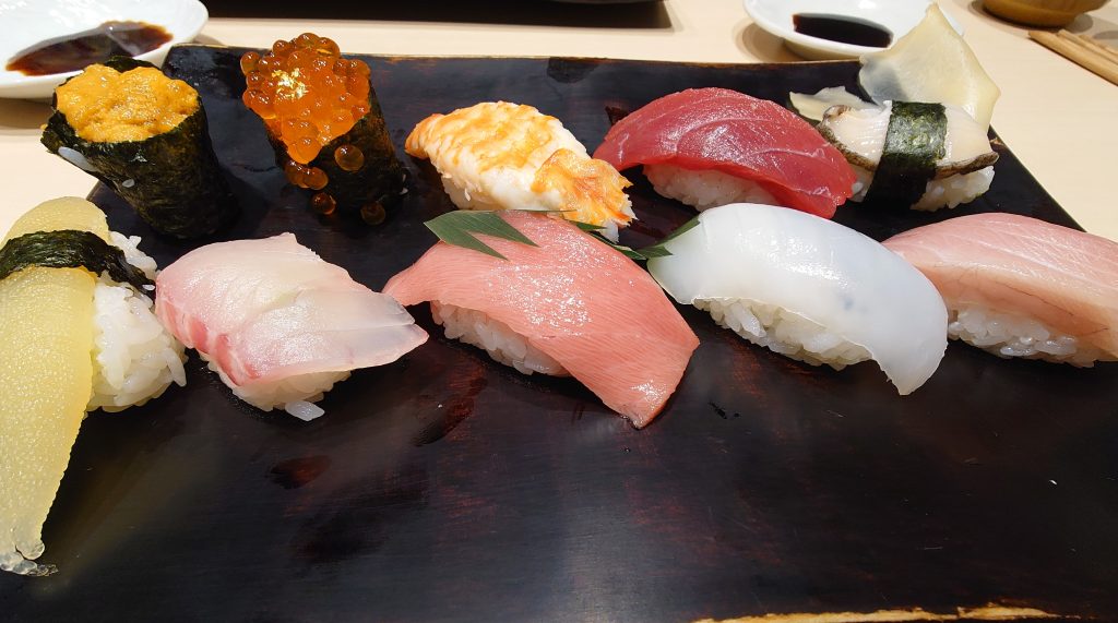 旦那は普段食べないアジなどの光物のお寿司を頼んで満足していました。