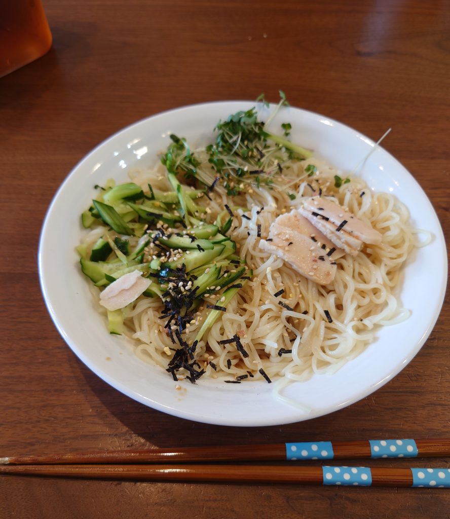 材料を切るところから盛り付け、配膳までやってくれました。卵やトマトがなく色合いが白と緑ですが、今日はあるもので、冷やし中華!