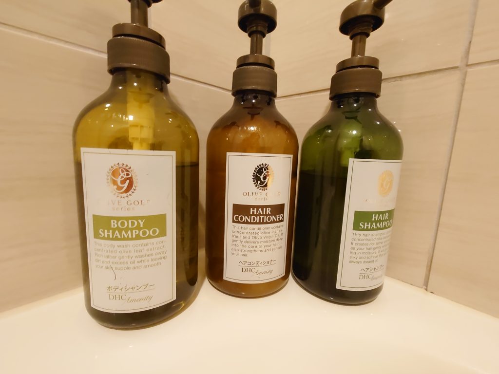 浴室のシャンプー、コンディショナー、ボディーシャンプー。