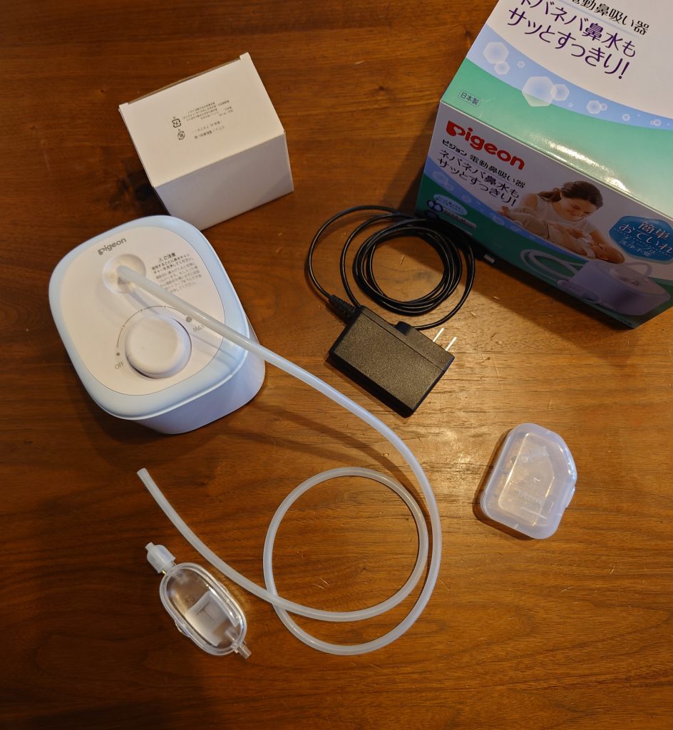 ピジョン電動鼻吸い器。咽頭軟化症だった子の、呼吸状態を少しでも改善して上げられればと思い購入。電動式でコンセンとに繋ぎダイヤルを回せばスイッチオン。右に回せば吸引力が強くなります。