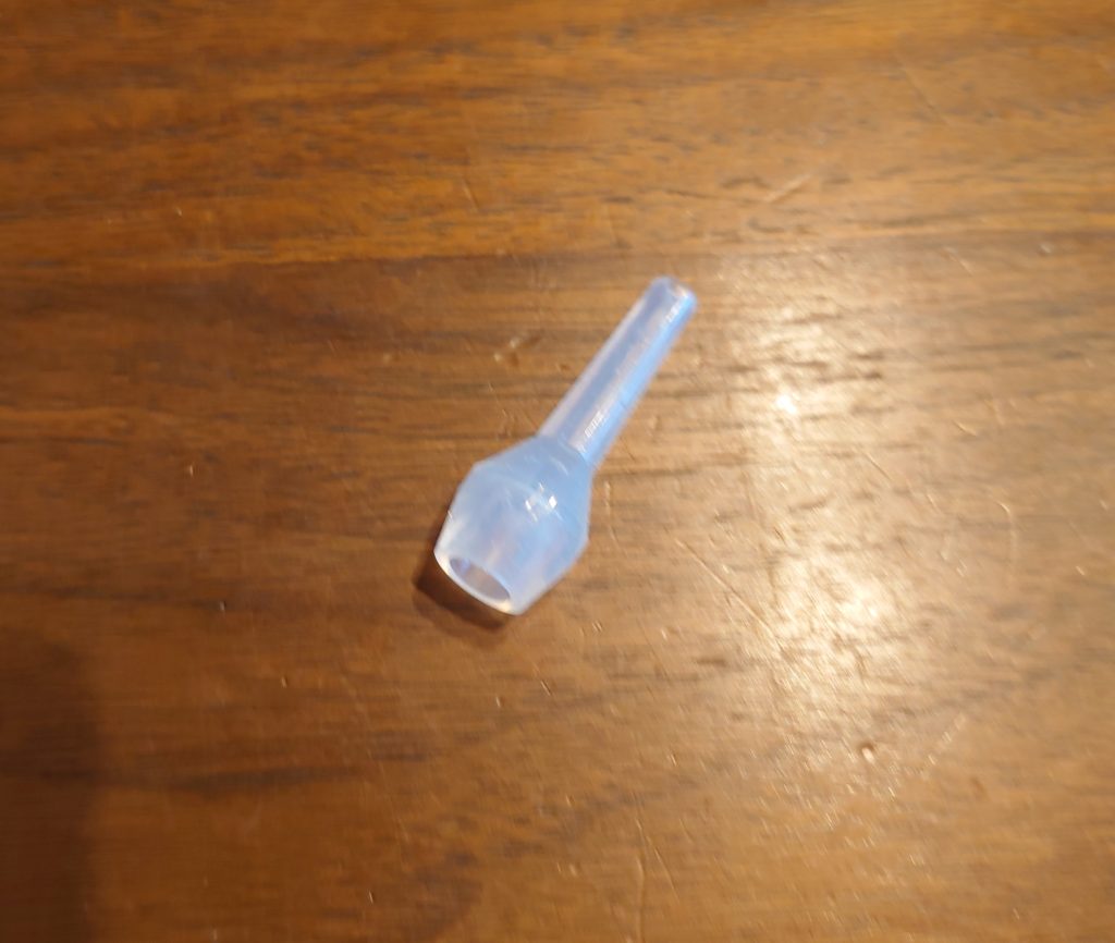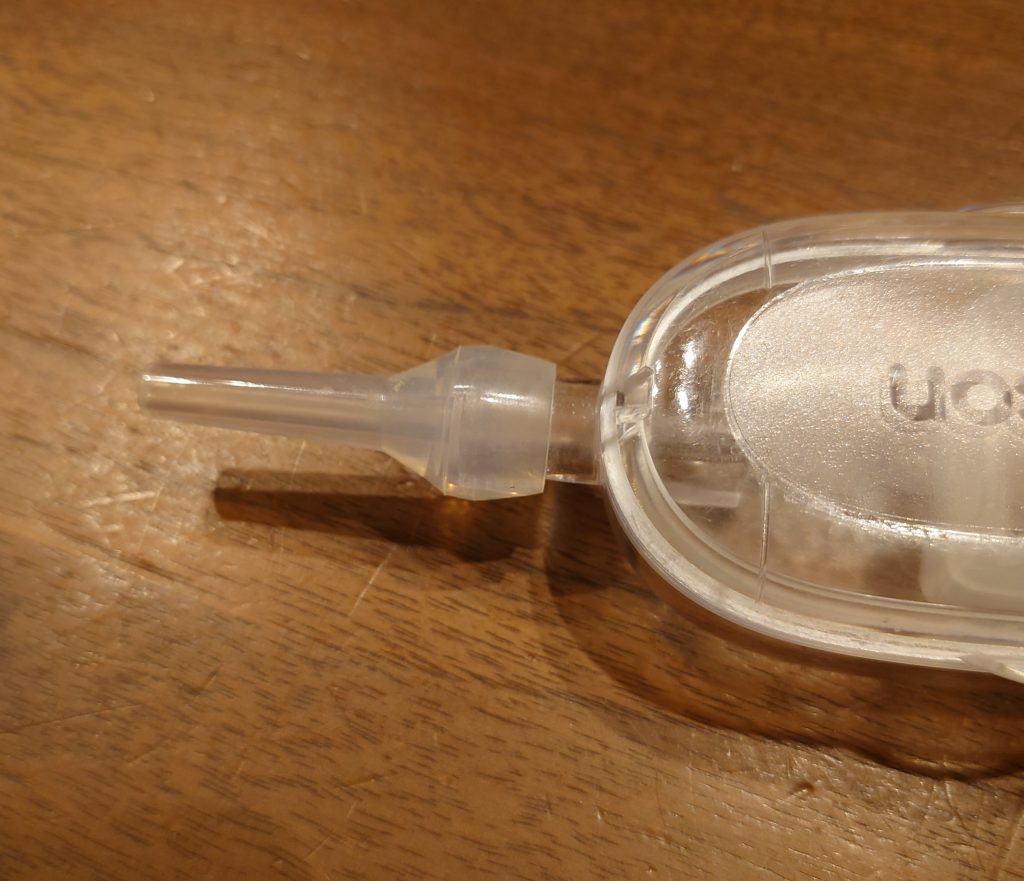 そんなある日、旦那がネットショッピングで購入したという追加アイテムそれが、「ボンジュール」鼻水キャッチャーの先にフィットノズルの代わりにつけるノズルです。口コミでも高い評価があり、値段も高くないので、お試しで購入したとのこと。しかしこれがあるとないとでは、吸引力が全然違います!最初からセットにして販売してほしいレベルです。気持ちいいくらい吸ってくれるので、1歳のうちの子は鼻水が出てくると自分で鼻に突っ込んで吸引するときもありました。少し先端が長いので、奥に入れすぎない注意は必要ですが、鼻づまりでお悩みのお子さんがいる家庭にはおすすめです。(うちでは一度紛失し、再度購入しました。)